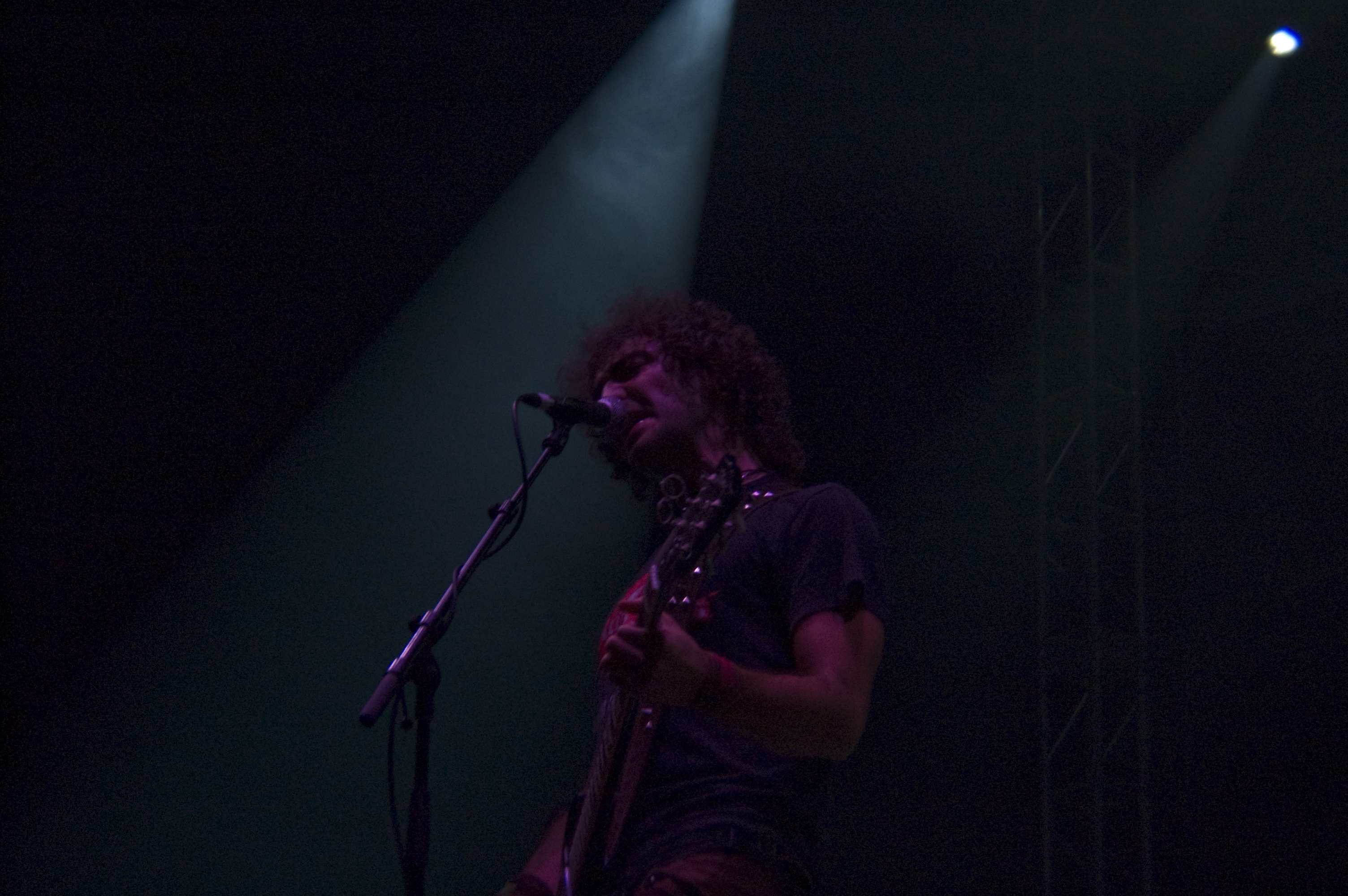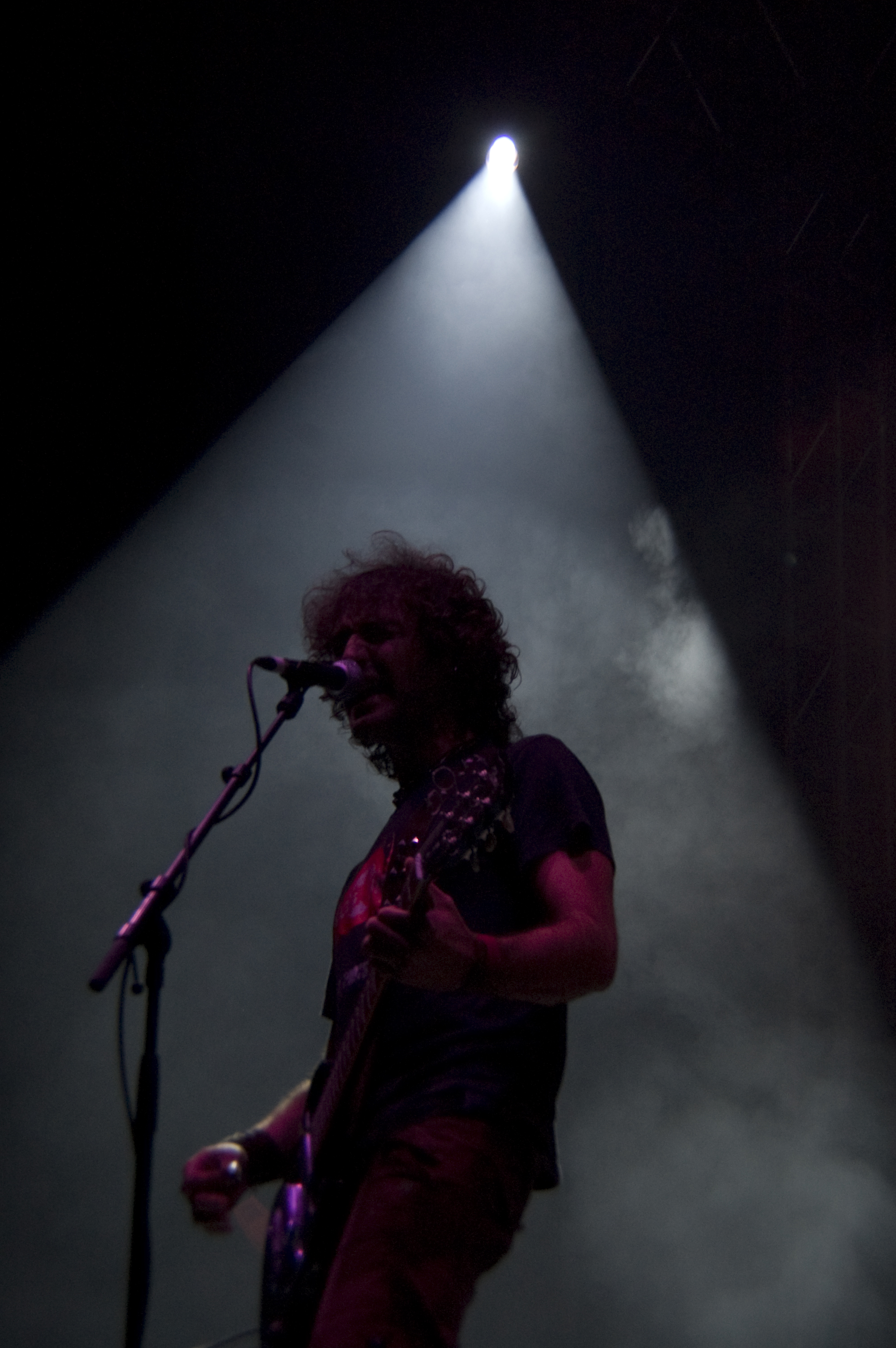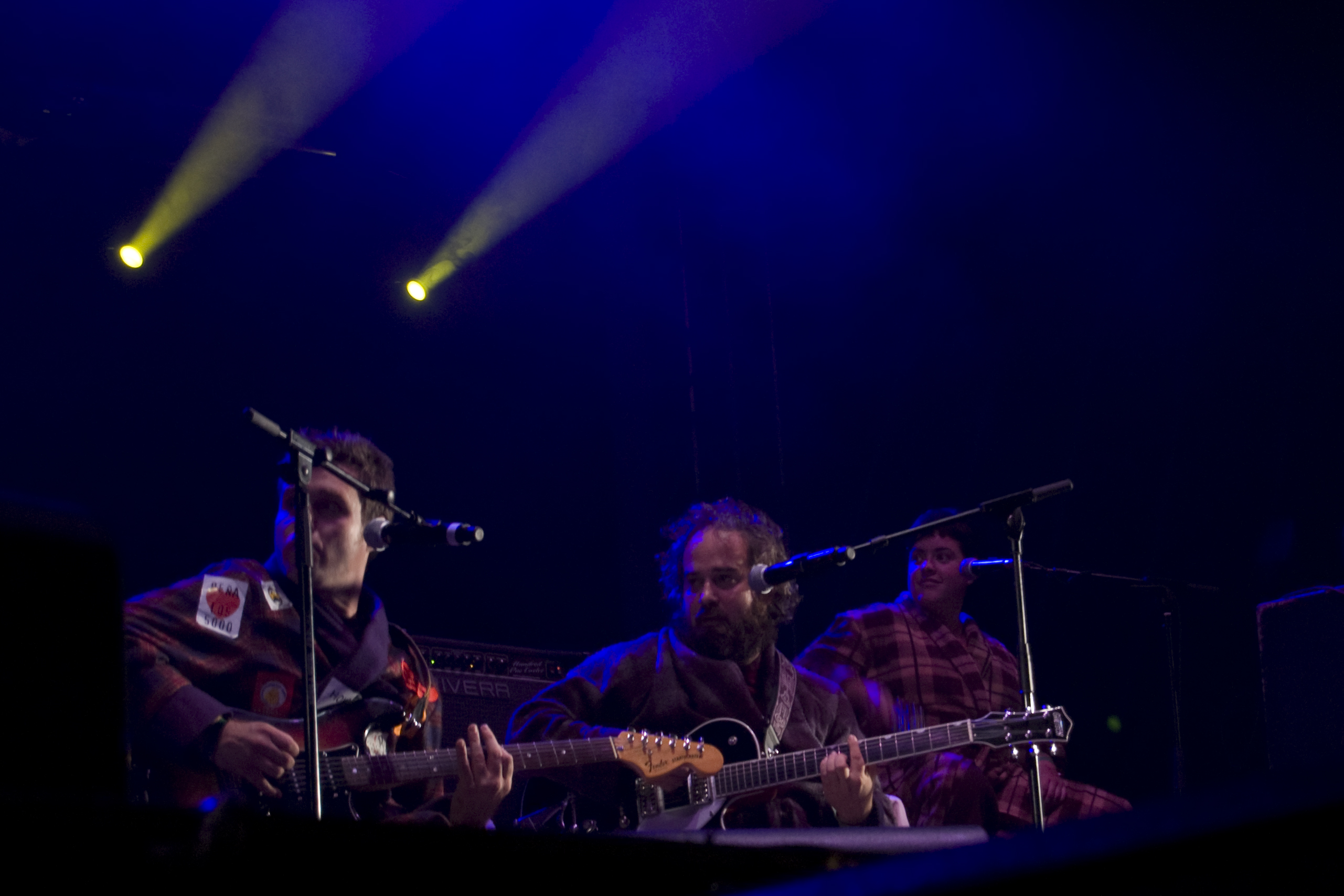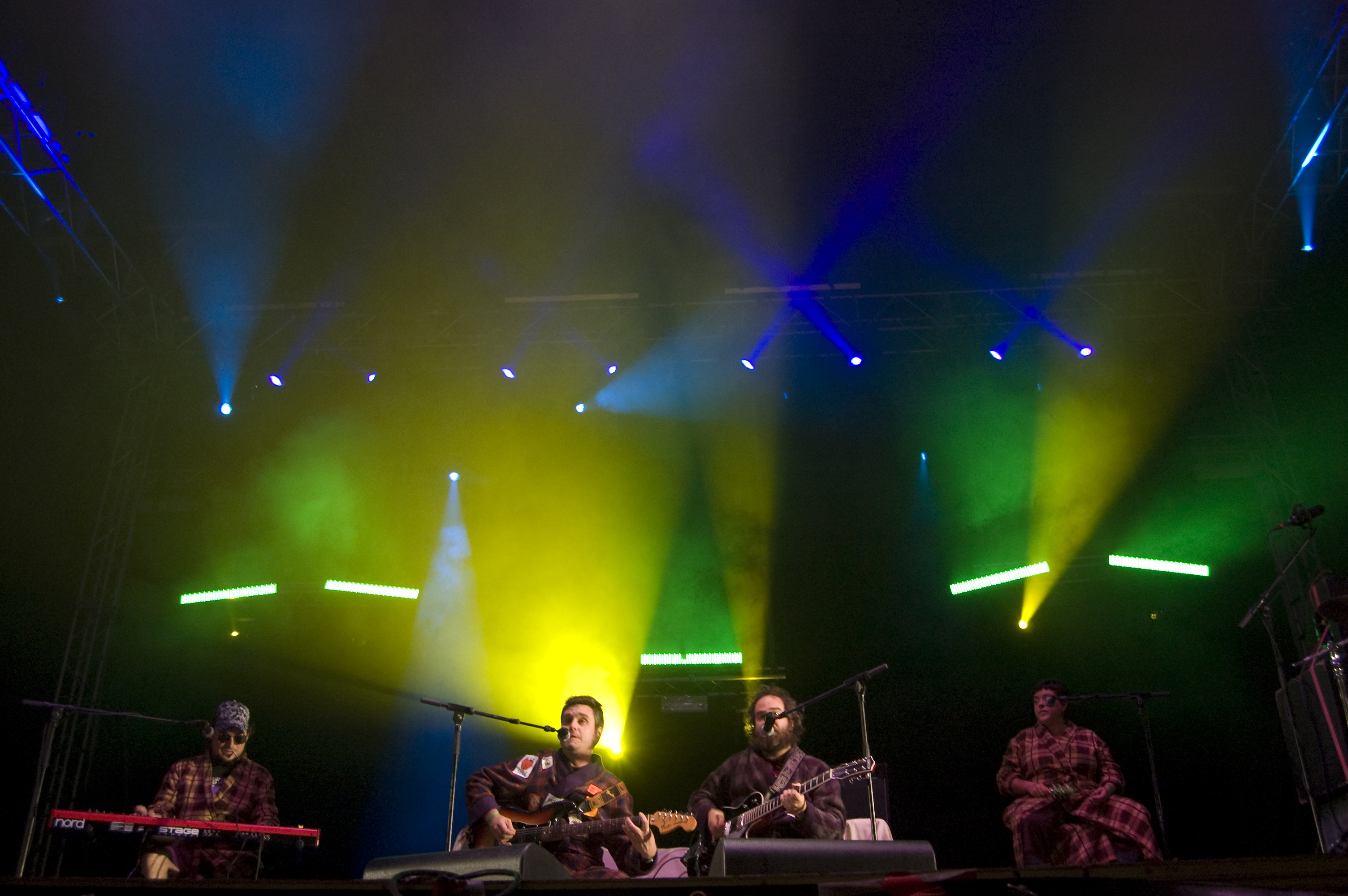 Un cuarto de hora para dejar todo listo para la nueva actuación, sofás incluidos, y aparecen en escena Escafandra, los alter-ego del duo humorístico Gandules. Con su habitual música electrónica comenzaron a mostrar su particular y surrealista puesta en escena, en esta ocasión acompañados por una banda al completo. Sorprendía la cantidad de gente presente con camisetas de merchandising del grupo, y lo numeroso del sector que conocía las canciones. Los Gandules animaron, y con sus paranoicas versiones acapararon el interés de casi todos los presentes, que no dudaron en corear las ocurrencias de la banda. Chistes continuos acerca de Bunbury, Valdespartera (la otra carpa de las fiestas de Zaragoza) y las salamandras de los telones laterales de Tako marcaron el hilo conductor de la velada. Una velada en la que introdujeron nuevos temas, como una versión de “You Can Leave Your Hat On” de Joe Cocker cuya temática oscilaba en torno al Coronel Tejero. Arrancó el concierto con toda la banda enfundados en sus batines, recostados en los sofás, para posteriormente librarse de ellos en una sección más movida. Su fusión entre cómicos, grupo de rock y orquesta de versiones caldeó la noche en un previo al plato fuerte de la misma: el concierto de Tako.